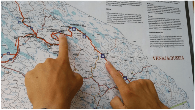 26.7.2021 herätyskello soi klo 7 reissun viimeisenä aamuna. Laitettiin kamppeet kasaan ja juomat reppuun. Piritta siivosi lattiaa, kun juomapussin letku oli alhaalla ilman tulppaa. Suolat ja urkkajuomajauheet lenteli, liekö väsymystä havaittavissa tai vain Piritan normaalia kohellusta. Jongunjoen majatalo tarjosi juoksentelijoille maittavan aamupalan. Ennen starttia sivistimme itseämme Rukajärven taistelu-infotaulusta.